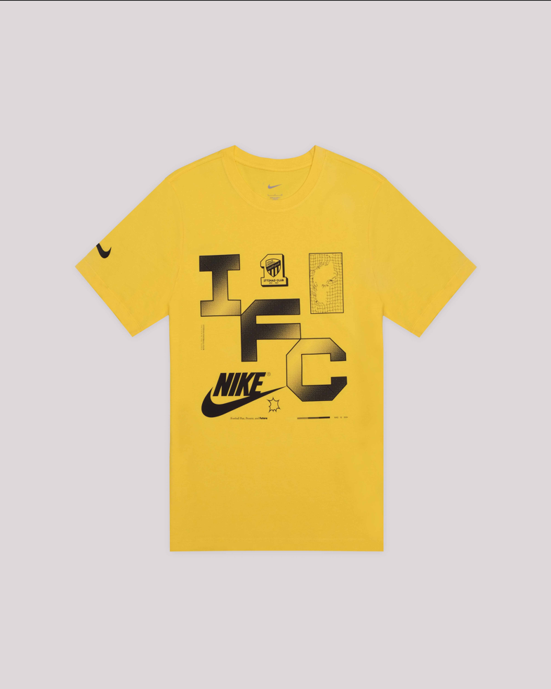 A vibrant yellow cotton t-shirt featuring the Nike Futura logo in black. A bold statement piece that celebrates energy, confidence, and club pride.