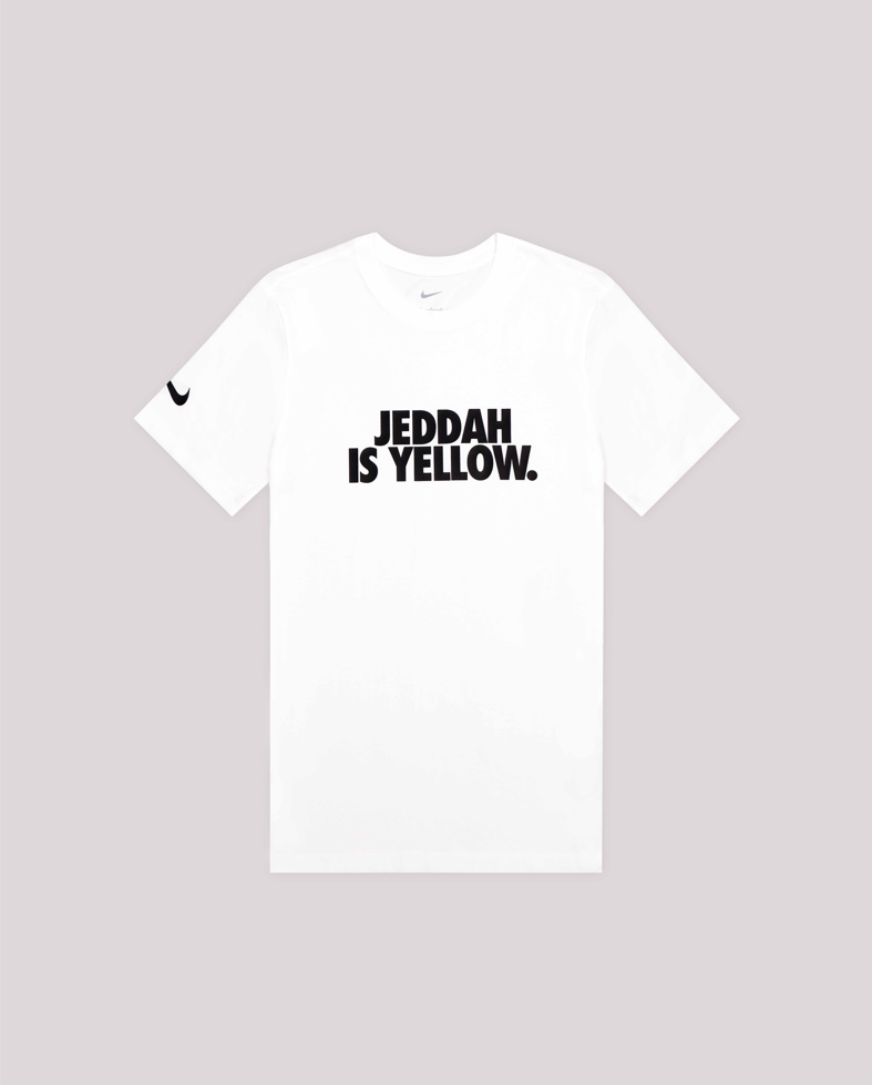 تيشيرت قطني أبيض يحمل عبارة «جدة صفراء»، يجسد فخر المدينة وهويتها المرتبطة بنادي الاتحاد.